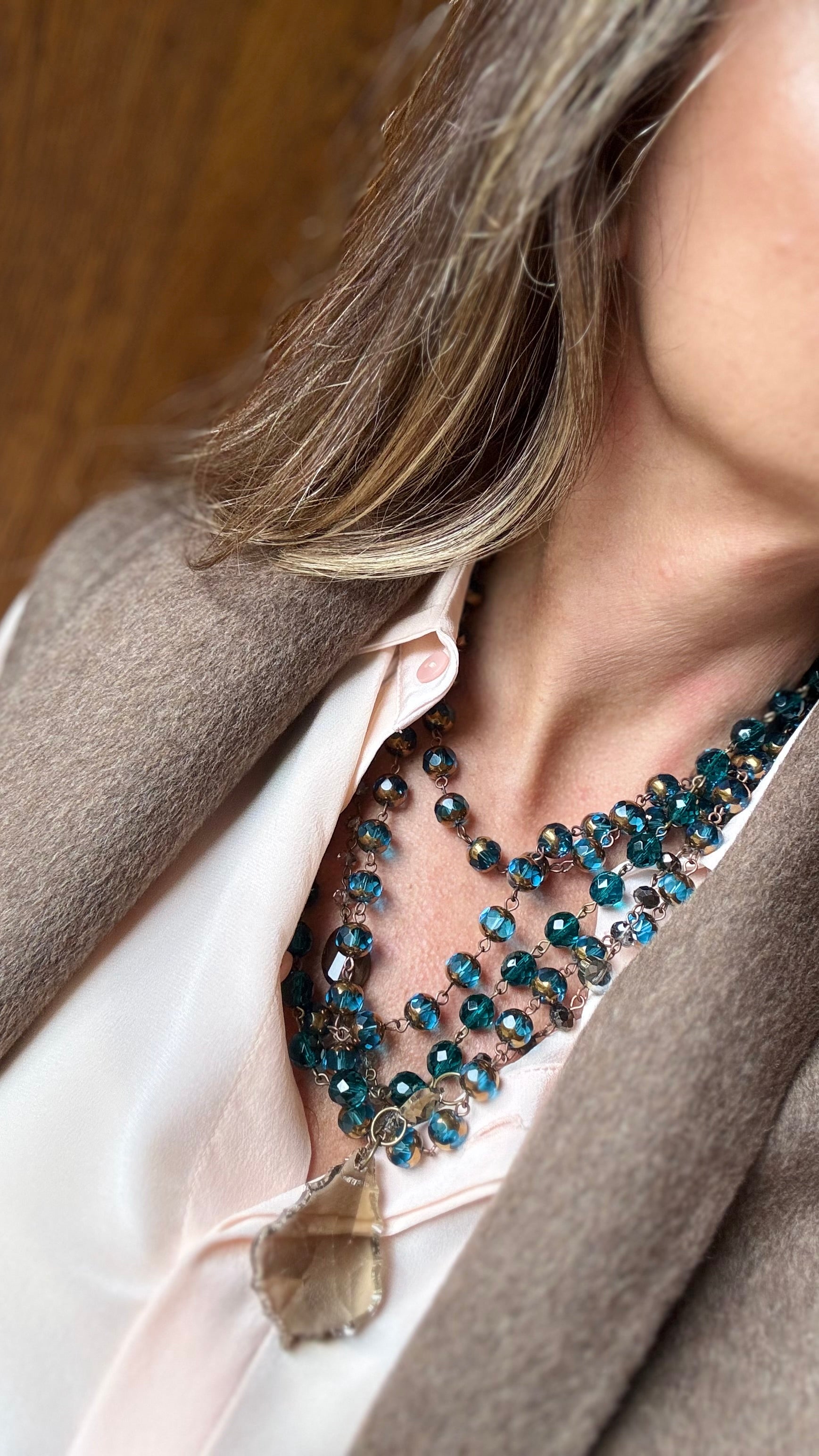 Diese verspielte Adila Kristall Kette kombiniert funkelnde Petrol-Kristalle mit warmem Bronze – ein echter Hingucker, der jedem Outfit einen lebendigen Farbakzent verleiht. Perfekt, um deinen Look mit einem Hauch von Glamour und guter Laune zu vervollständigen!