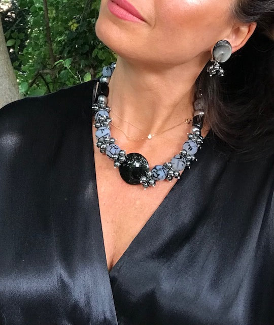 Opulente-Halskette mit verschiedenen Formen und Nuancen präsentiert Catia Levy, die auf die klassischen Farben Schwarz und Grau setzt.