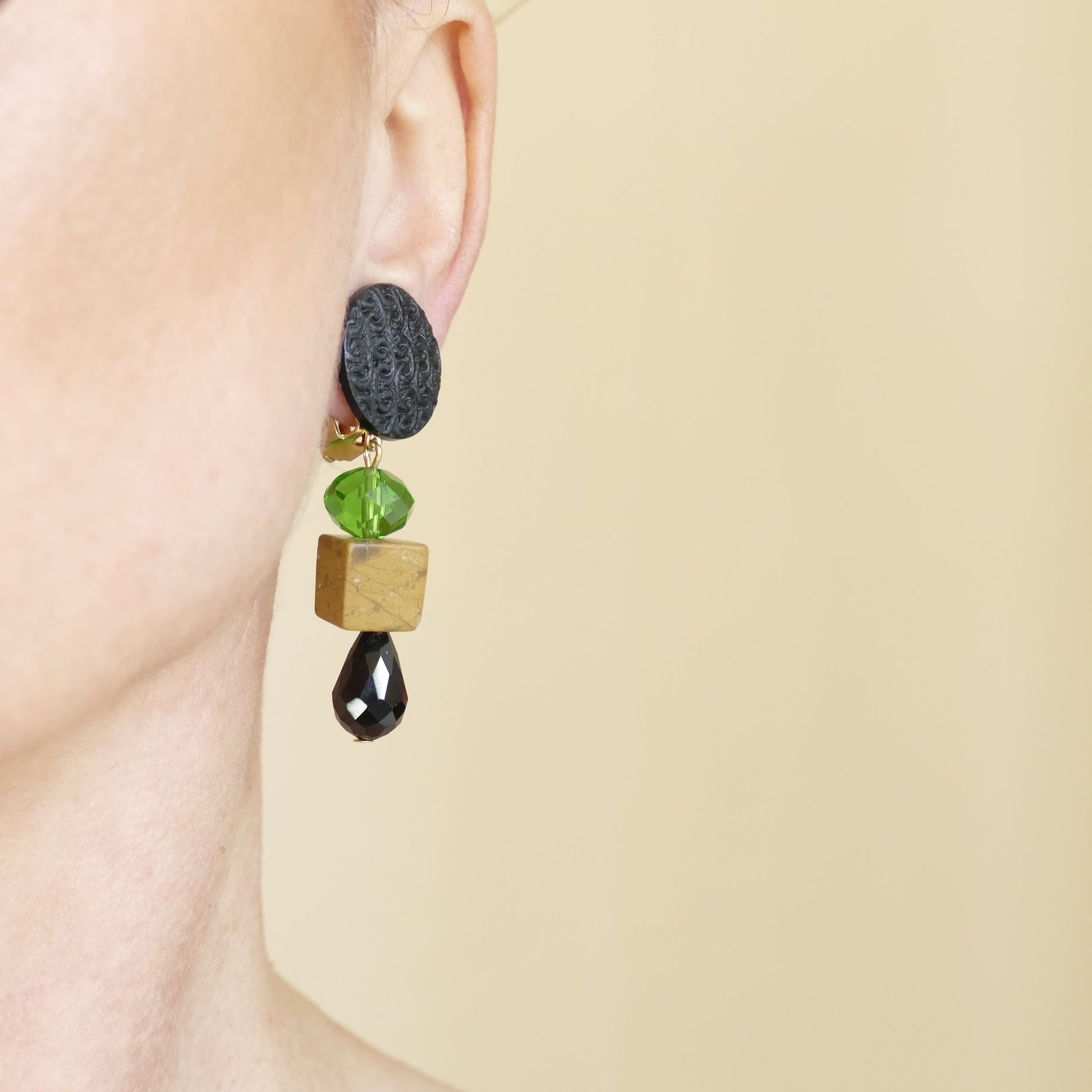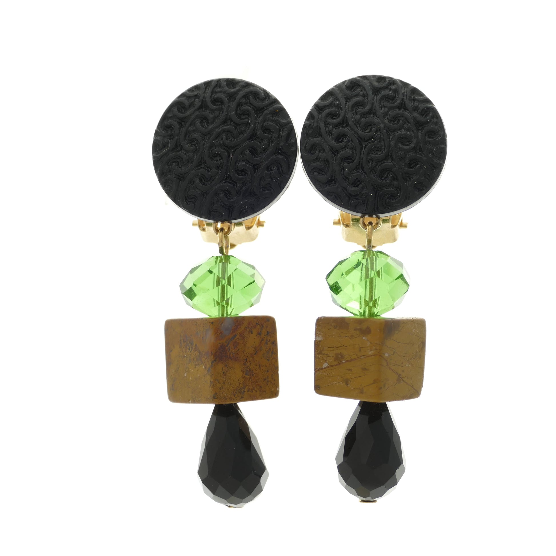 Erica Ohrclip Ohrschmuck aus Messing, Gold vergoldet, leicht und modern Ohrringe zu tragen in Schwarz, Grün und Braun Farbe.