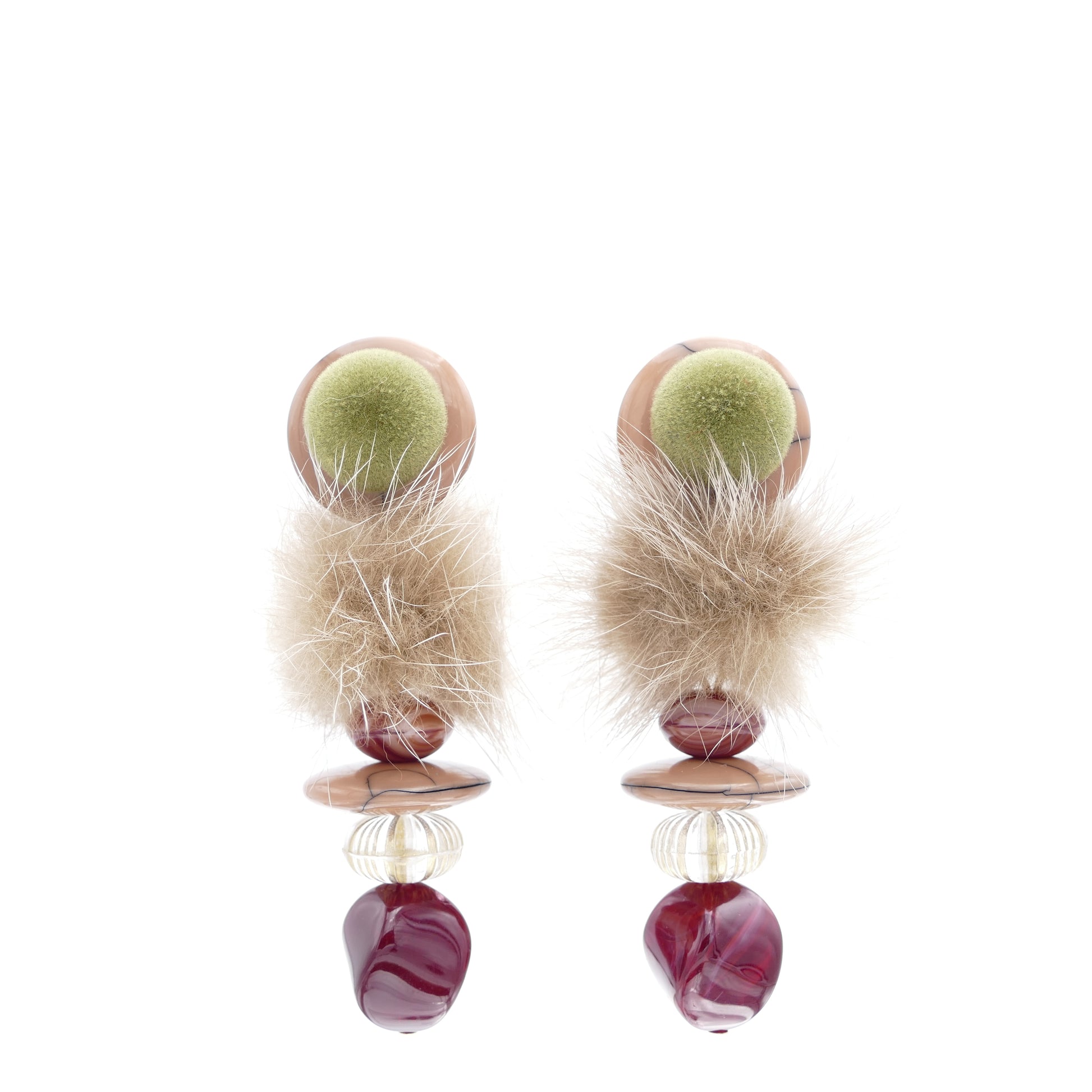 Lange Ohrringe Versilbert Fell-Pelz Beige, Grün Mit Rot Perle