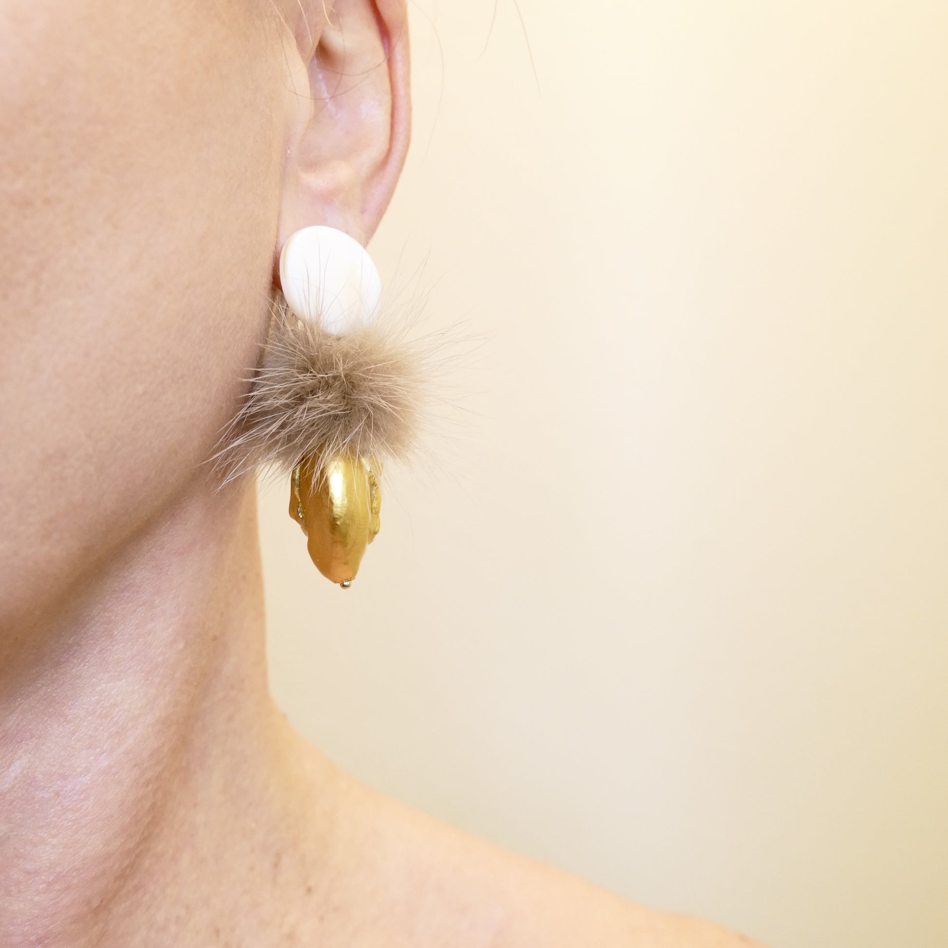 Ohrclips Fell-Pelz mit Perlmuttperlen und Gold Perle Element